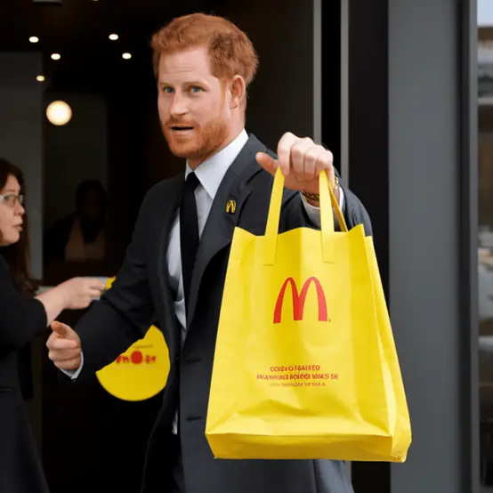 以英国哈里王子打包麦当劳食品的图像为例,这是一张用AI生成的图片。尽管图中黄色包装袋上显示的餐厅标志看起来很逼真,但袋子上的文字却是胡言乱语。