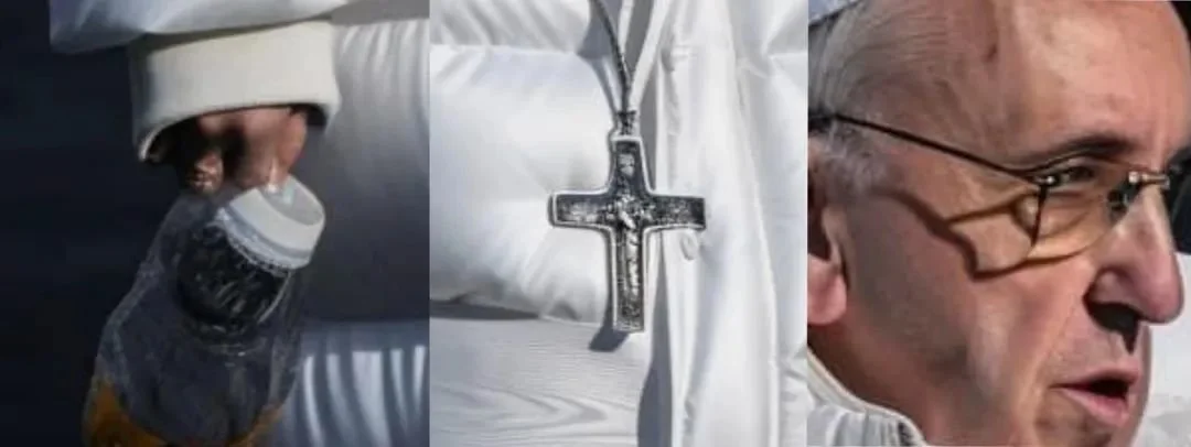 方济各脖子上佩戴的传统胸饰十字架(红圈内)只有一条带子。