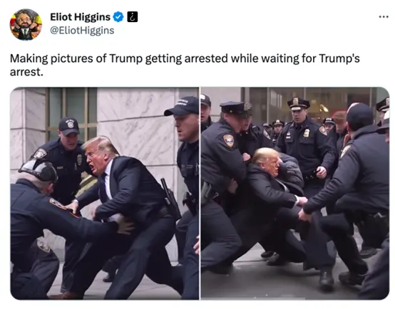 Bellingcat创始人Eliot Higgins用Midjourney创造了一组展示特朗普被捕的图片。