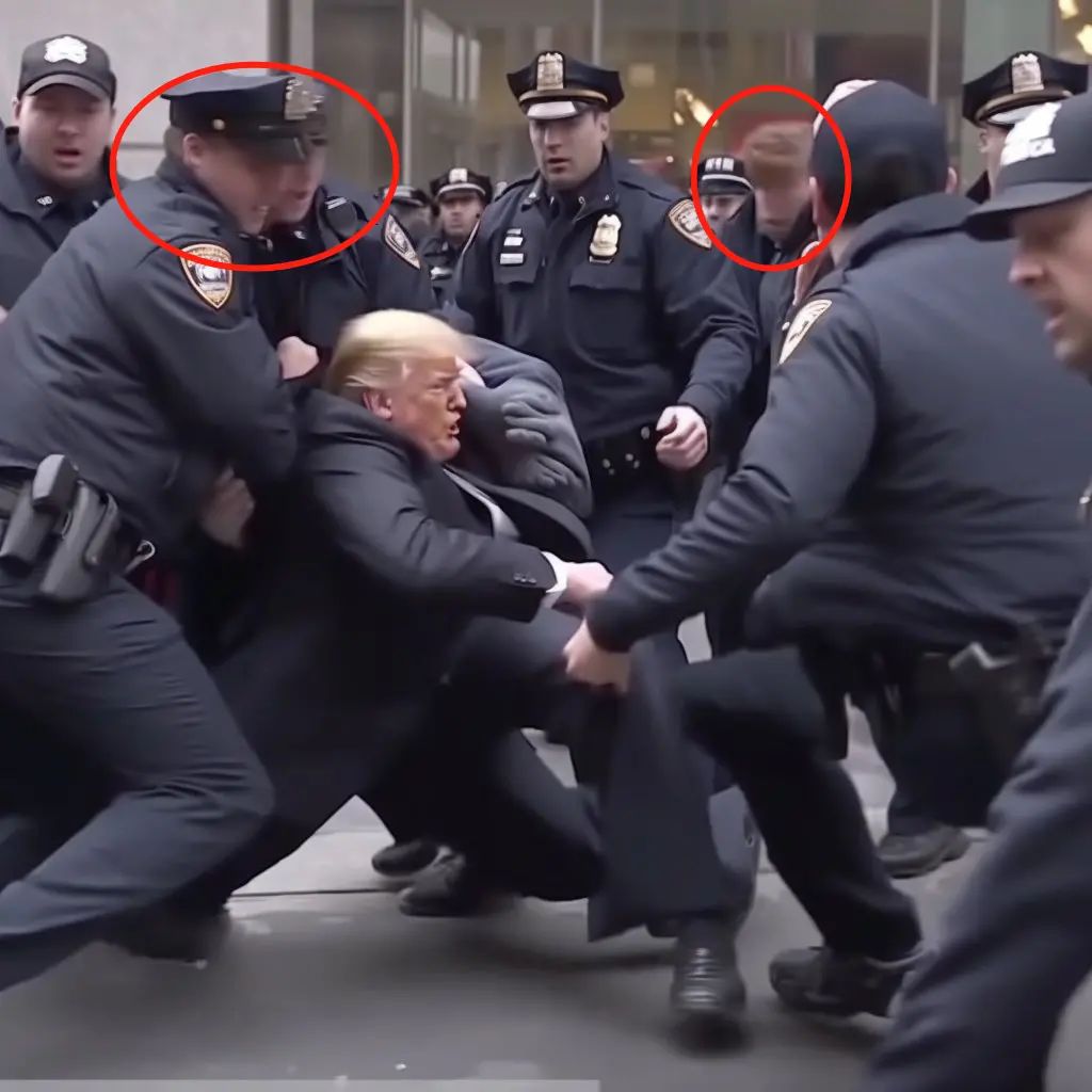 第四,扫描背景。人工智能生成的图像可能会有模糊或扭曲的细节,这一点在图像背景中尤其明显。例如在这张显示特朗普被捕的假图中,当我们将目光从画面中心移开时,就不难注意到,背景中执法人员的脸早已模糊或变形。