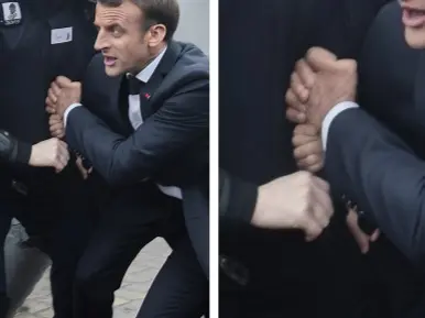 DALL-E生成的虚假图像:骚乱中的法国总统马克龙。其手部手指的数量和姿势均十分怪异。