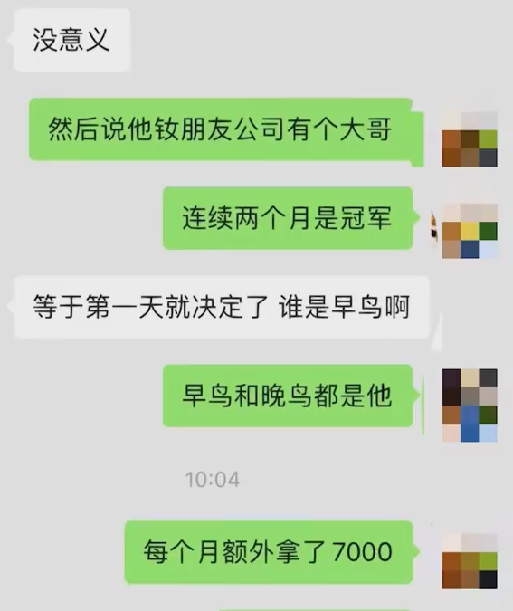 据该网友称,早鸟奖就是给一个月来得最早的人,奖励4000元,晚鸟奖则是一个月走得最晚的人,奖励3000元,都按当月早到、晚退的平均时间计算,