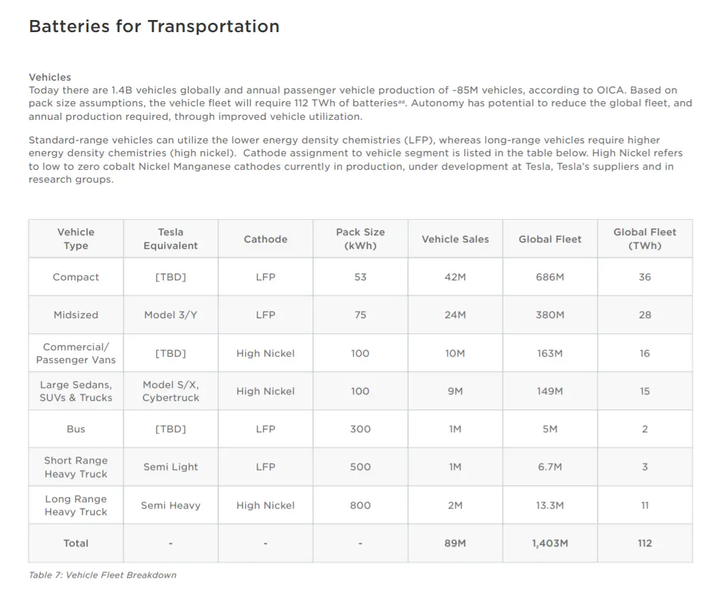 值得注意的是,文件中提到,特斯拉在研的紧凑型电动汽车计划配备53kWh的磷酸铁锂电池,目标销量为4200万辆——这一目标销量几乎是Model 3/Y的两倍,这两款中型汽车计划配备75kWh的磷酸铁锂电池,目标销量2400万辆。Model S/X及Cybertruck等车型计划配备100kWh高镍电池,目标销量为900万辆;另外,短途重卡、长续航重卡计划分别配备500kWh、800kWh高镍电池,目标销量合计300万辆。目前特斯拉规划的所有车型总目标销量为8900万辆。