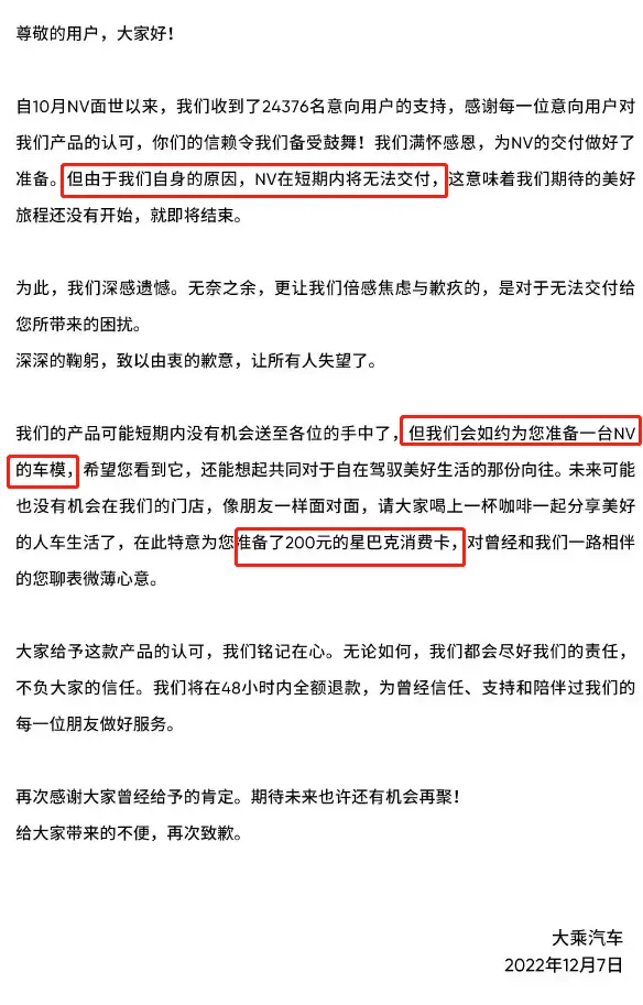 而在到了同年12月,自游家汽车因造车资质问题,无法交付车辆而发起了全额退款,并提供一定的补偿措施:NV车模一个、200元星巴克消费卡一张。