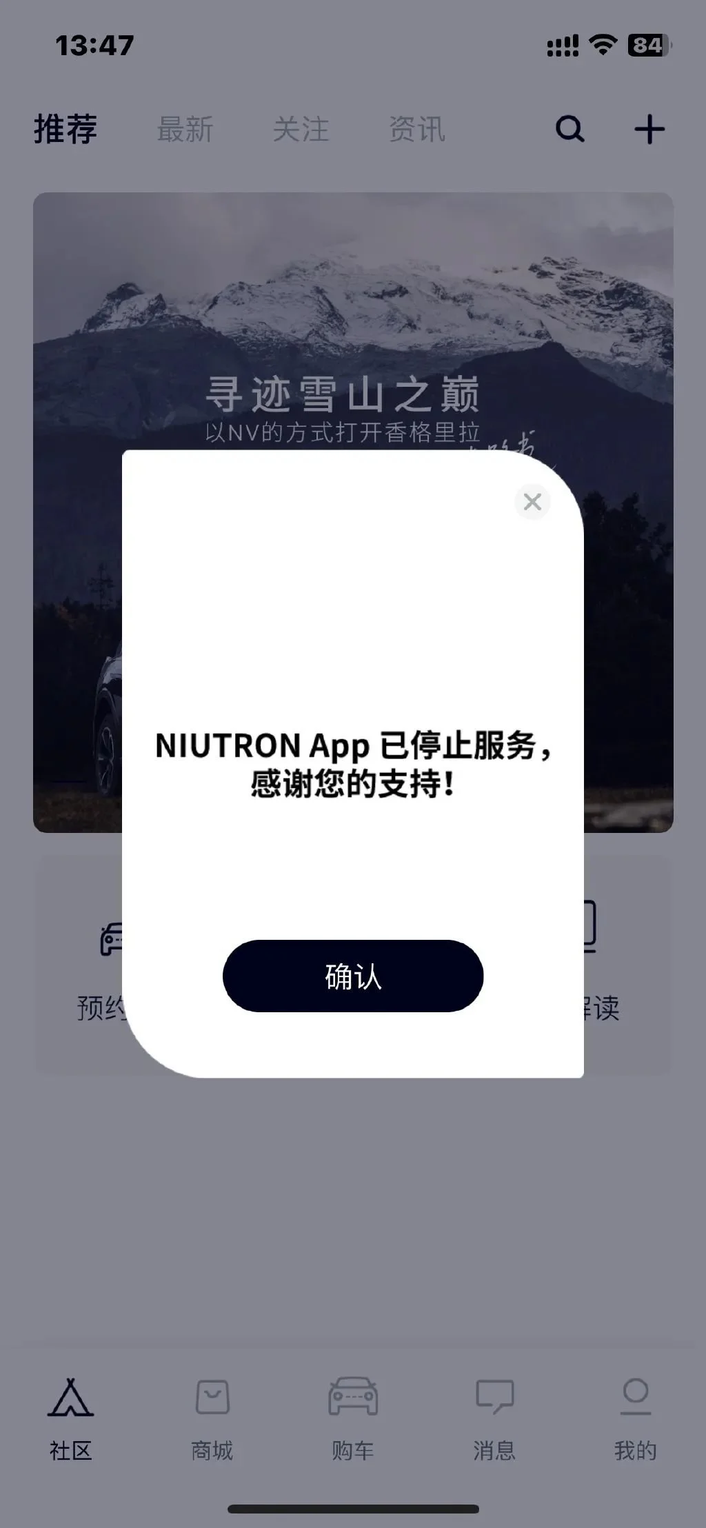 4月6日的消息,造车新势力自游家 NIUTRON,官方APP——NIUTRON,宣布停止服务。另外自游家官网,已经无法打开。官方微博,也全部清空。