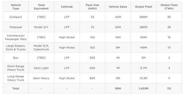 特斯拉进一步估计了每个车型的平均电池容量,由此得出结论,全球需要大约112TWh的电池容量,才能将全球车辆转向纯电动汽车。基于此,每个车型的电池容量与特斯拉的任何车型都没有关系,数值只是一个行业平均水平。