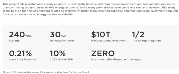 宏图3最后总结道,“地球完全电气化和可持续的未来在技术上是可行的,与继续当今不可持续的能源经济相比,它也需要更少的投资和更少的原材料开采。”