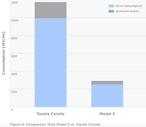 一个具体的例子是,特斯拉的Model 3能效为131MPGe(MPGe表示每加仑汽油当量的英里数,33.7kWh的电力= 1加仑气体),而丰田卡罗拉为 34MPG(每加仑油的英里数),相差3.9倍,考虑到上游损失,如与提取和提炼燃料有关的能源消耗,该比率会增加。