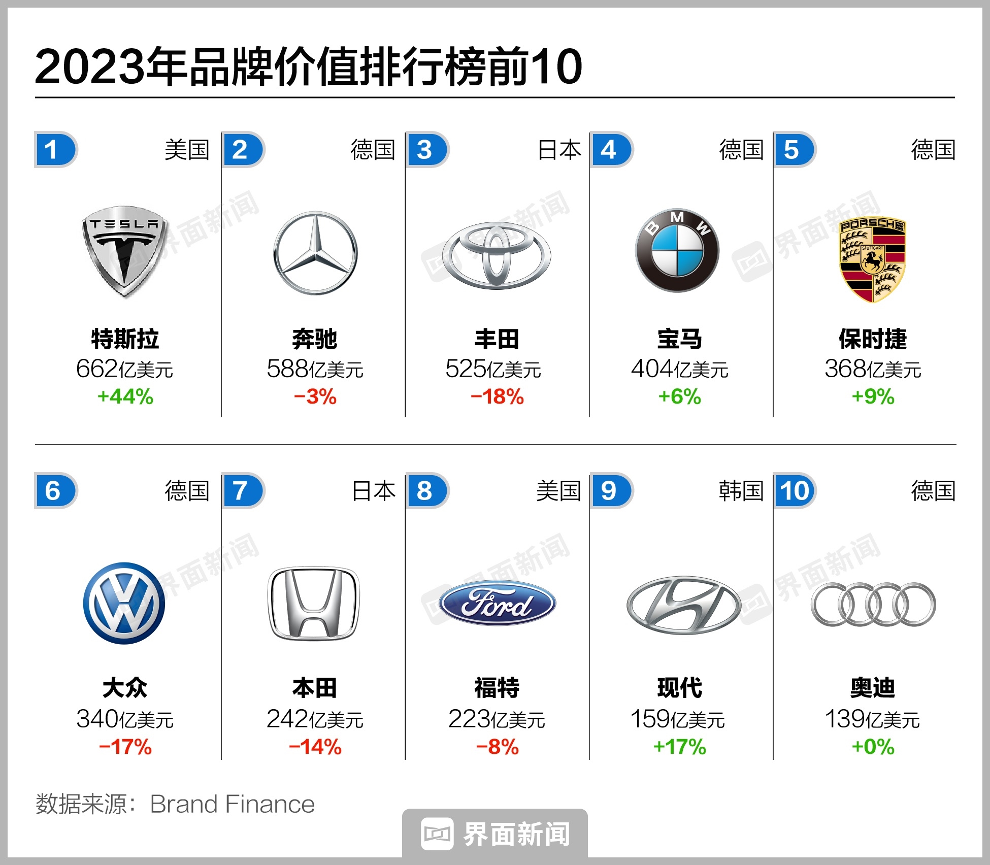 具体排名方面,特斯拉以662亿美元估值位列第1,奔驰和丰田分居2、3位,宝马、保时捷和大众三家德国汽车公司占据第4至6位,第7到第10名则分别被本田、福特、现代和奥迪占据。