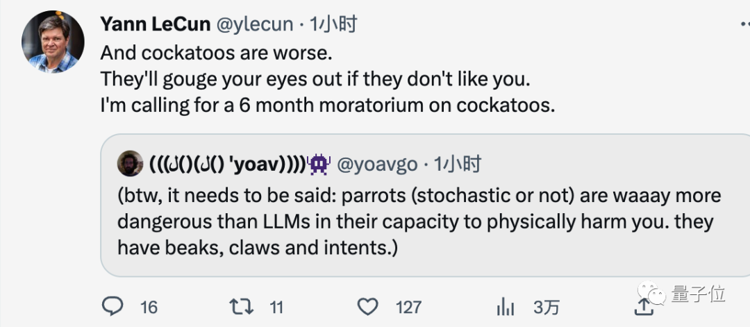 LeCun补充道,澳大利亚凤头鹦鹉更凶狠,我呼吁对凤头鹦鹉实施6个月的管制。