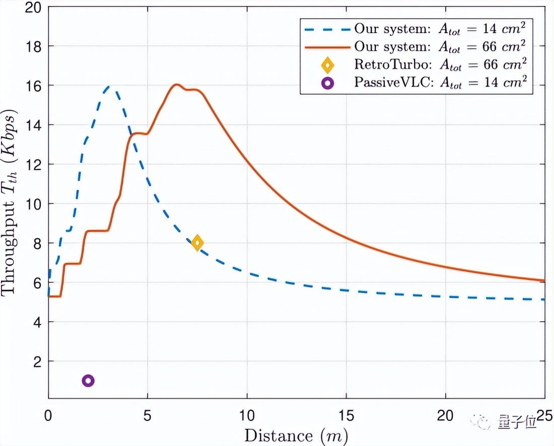 结果显示,同等调制面积与同等传输距离下,他们的系统均优于目前最先进的方式,最高传输速率可达16Kbps。