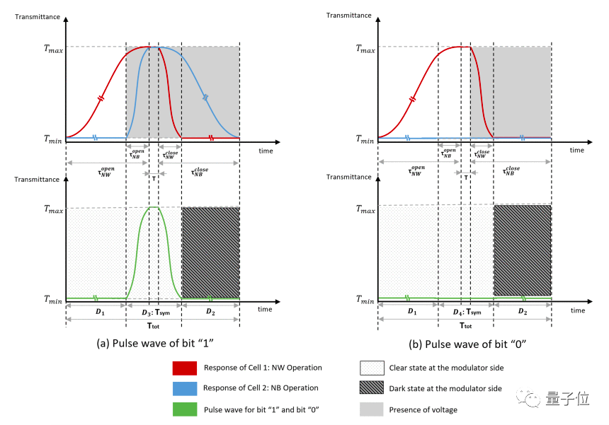 从下图能看出,红线为常白模式对信号1的输出,蓝线为常黑模式,当两者堆叠后,信号「1」的脉冲(绿色曲线)更短,变化更迅速,在通信编码中效率更高。