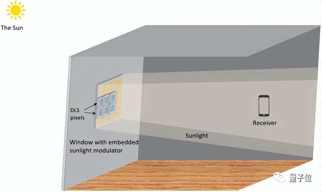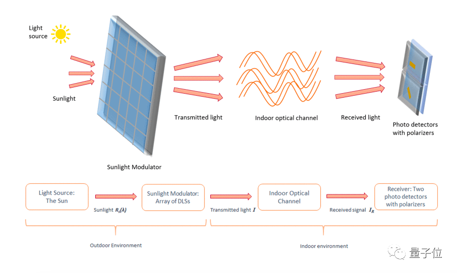先让阳光照射过智能玻璃窗,窗子本身就是调制器,通过DLS改变光波偏振情况,对其进行调制编码。