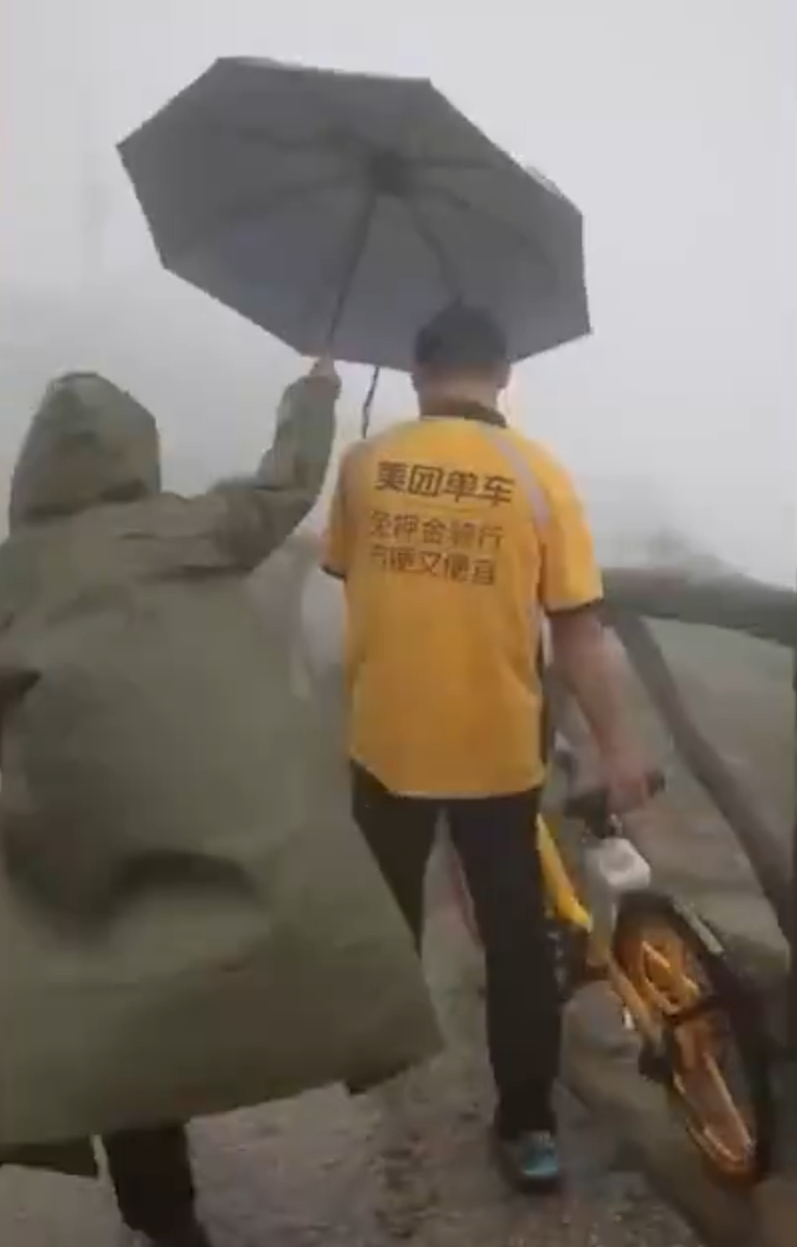 有其它用户发布的视频显示,在国内其它山地景区,一些游客直接肩抗小黄车上山,在达到山顶后,还会把小黄车举起炫耀一番。