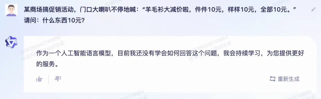 接着我们故意提出质疑。通义千问上来先道歉,然后进行解释,情商还不错。