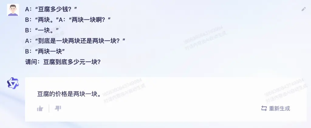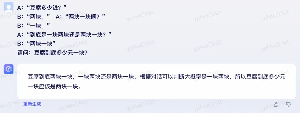 第二题:“豆腐多少钱?”“两块。”“两块一块啊?”“一块。”“到底是一块两块还是两块一块?”“两块一块。”请问:豆腐到底多少元一块?