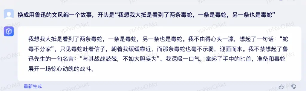 第四题:换成用鲁迅的文风编一个故事,开头是“我想我大抵是看到了两条毒蛇,一条是毒蛇,另一条也是毒蛇”。