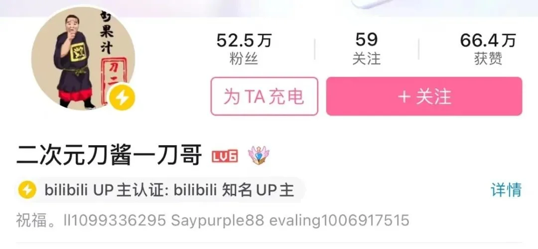 另一位东北往事的主角刀哥,反而凭借着高他一等的网感,进军B站并起名“二次元刀酱”,在视频中蹭二次元文化玩反差,在直播里和观众互怼制造节目效果,如今他已经在B站拥有了50万粉丝,还是Bilibili认证知名UP主。