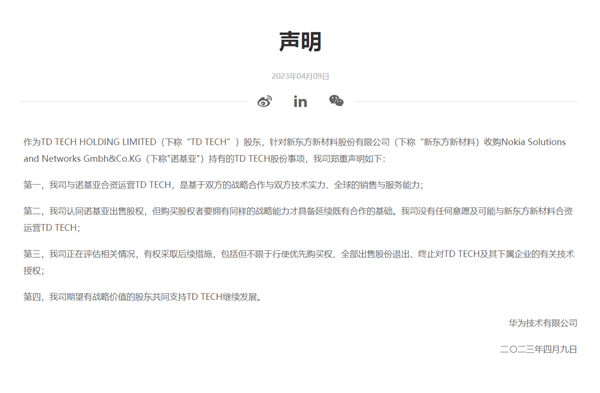 华为称正在评估相关情况,有权采取后续措施,包括但不限于行使优先购买权、全部出售股份退出、终止对TD TECH及其下属企业的有关技术授权。