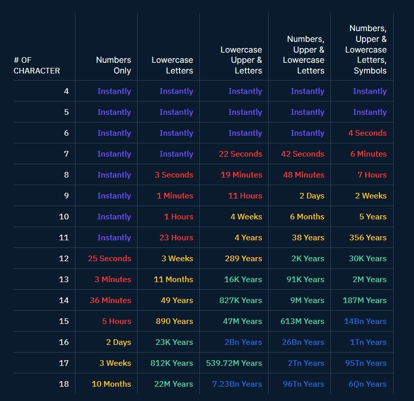 报告提示用户使用强密码,建议使用大小写字母、数字和符号的组合密码。以12位字母密码为例,PassGAN需要289年才能破解密码;如果再加上数字,时间将延长到2000年;如果再加上符号,则需要30000年。