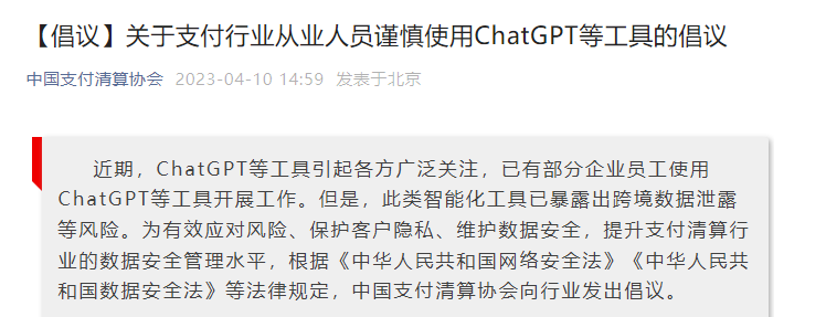 今日,中国支付清算协会发出“关于支付行业从业人员谨慎使用ChatGPT等工具”的倡议。倡议表示,近期,ChatGPT等工具引起各方广泛关注,已有部分企业员工使用ChatGPT等工具开展工作。但此类智能化工具已暴露出跨境数据泄露等风险。