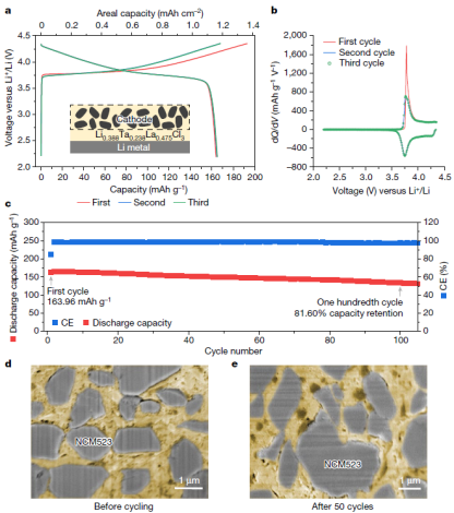 得益于镧系金属元素的低电负性,以及金属氯化物良好的耐氧化性和可变形性,镧系金属卤化物基固态电解质可直接与锂金属负极和三元正极匹配,实现无任何电极修饰且室温可运行的全固态锂金属电池。相关研究成果以《A LaCl3-based lithium superionic conductor compatible with Li metal》为题,于4月5日发表在Nature杂志上。