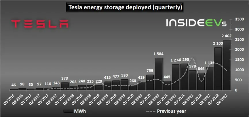 特斯拉在2022年第四季度储能装机量达到2.46GWh,同比增长152%,2022全年储能装机量达到6.54GWh,同比增长64%。