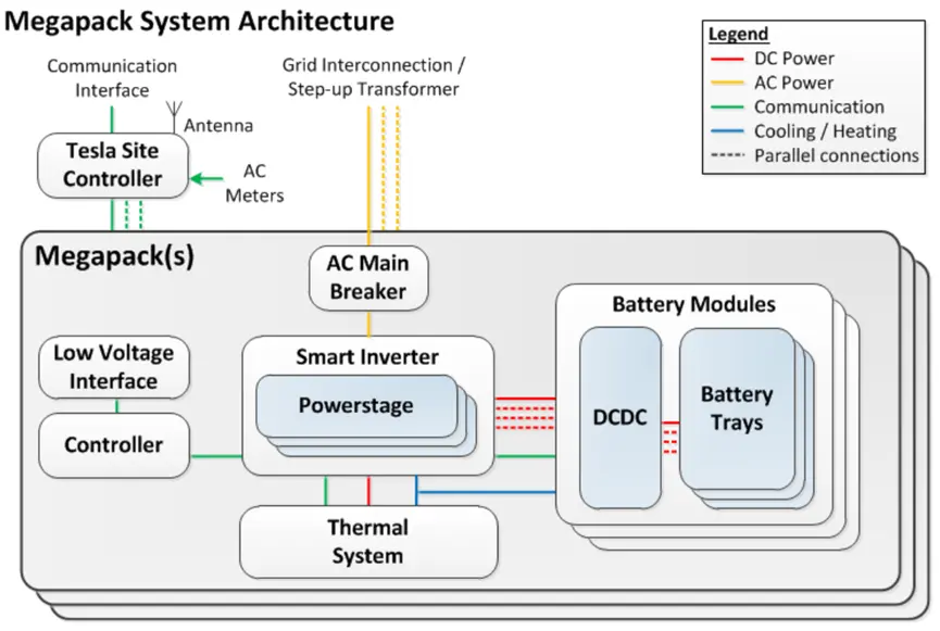 储能系统的核心在变流器,特斯拉在变流器环节一直是自主研发,掌握着变流器的控制算法技术。可以看到储能系统架构图中特斯拉将Megapack中的储能变流器标记为了Smart Inverter。