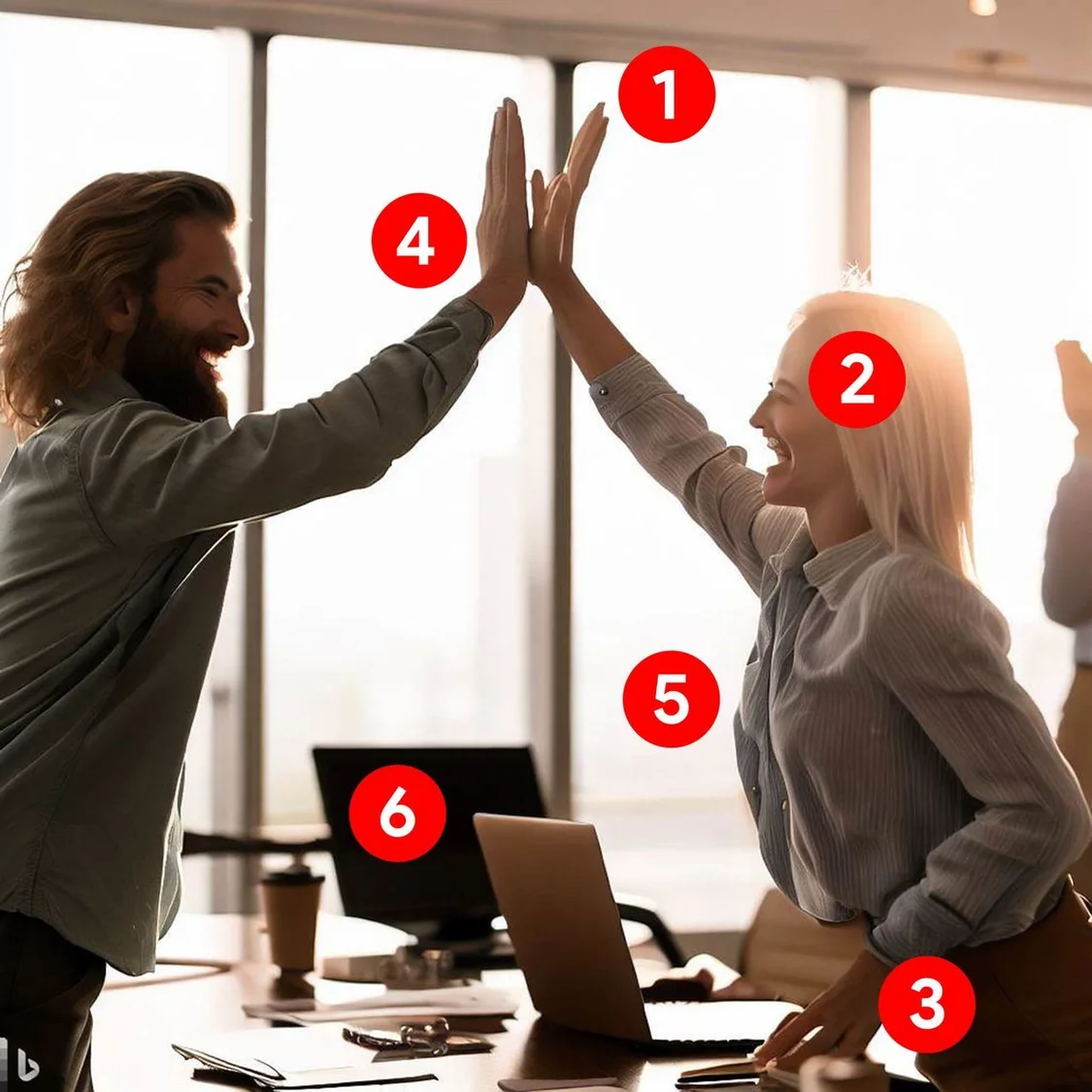 上图是一张由微软必应图像生成器生成的图片,里面有6个破绽,相对容易分别。如果不看标记,你能找出这6个图片漏洞吗?1.她的手指极长且扁平。 2.她的嘴巴似乎少了几颗牙齿,陷进了她的脸。3. 她的手进入了桌子里。 4. 他的手指又长又扁。 5.她的衬衫下垂不自然。6.桌子上的物品混合在一起。