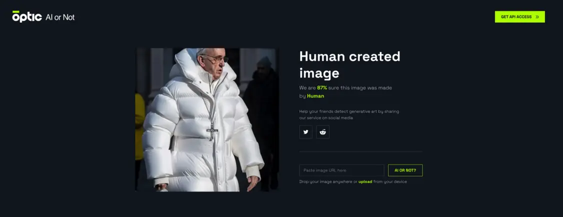 一些开发人员正在开发工具,通过分析图像以寻找人工智能做图迹象的工具。但问题是,除非这些工具与它们所监视的图像生成器保持同步,否则即使是它们也可能被愚弄。例如,AI信任和安全公司Optic的工具就被欺骗了,它认为有87%的可信度相信教皇穿着巴黎世家羽绒服的图片是人类拍摄的。