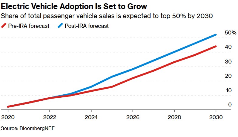 一些知情人士表示,这些要求,再加上新的联邦法律中的电动汽车和充电桩激励措施,预计将使得美国在2032年实现销售的三分之二的新汽车以及轻型卡车为电动汽车类型。据BloombergNEF报道,这将比美国2022年纯电动和插电式混合动力汽车新销量所代表的个位数级别市场份额大幅增长。