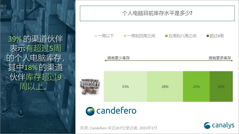 Canalys高级分析师Ishan Dutt表示,去年下半年困扰行业的大多数问题都延续到了2023年年初。渠道伙伴表示,他们的库存水平一直在减少,但从绝对值来看仍处高位。Canalys在2023年1月渠道调研报告显示,39%的渠道伙伴表示有超过5周的个人电脑库存,其中,18%的合作伙伴表示有9周以上的库存。同时,所有商用市场的需求仍受抑制,美国、欧洲和其他市场进一步加息给商用市场带来更大压力,降低通胀将成为这类市场的首要任务。消费者和企业在短期内对新个人电脑的支出仍将保持谨慎,预计市场将在2023年第四季度才开始复苏。