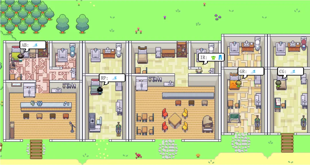 在这个游戏中,斯坦福的人机交互小组用大语言模型做了一个有25个AI角色的数字小镇,这些角色自由自在的在里面生活,并且涌现出了很多高可信度的社会行为,例如时间协调甚至是情人派对。