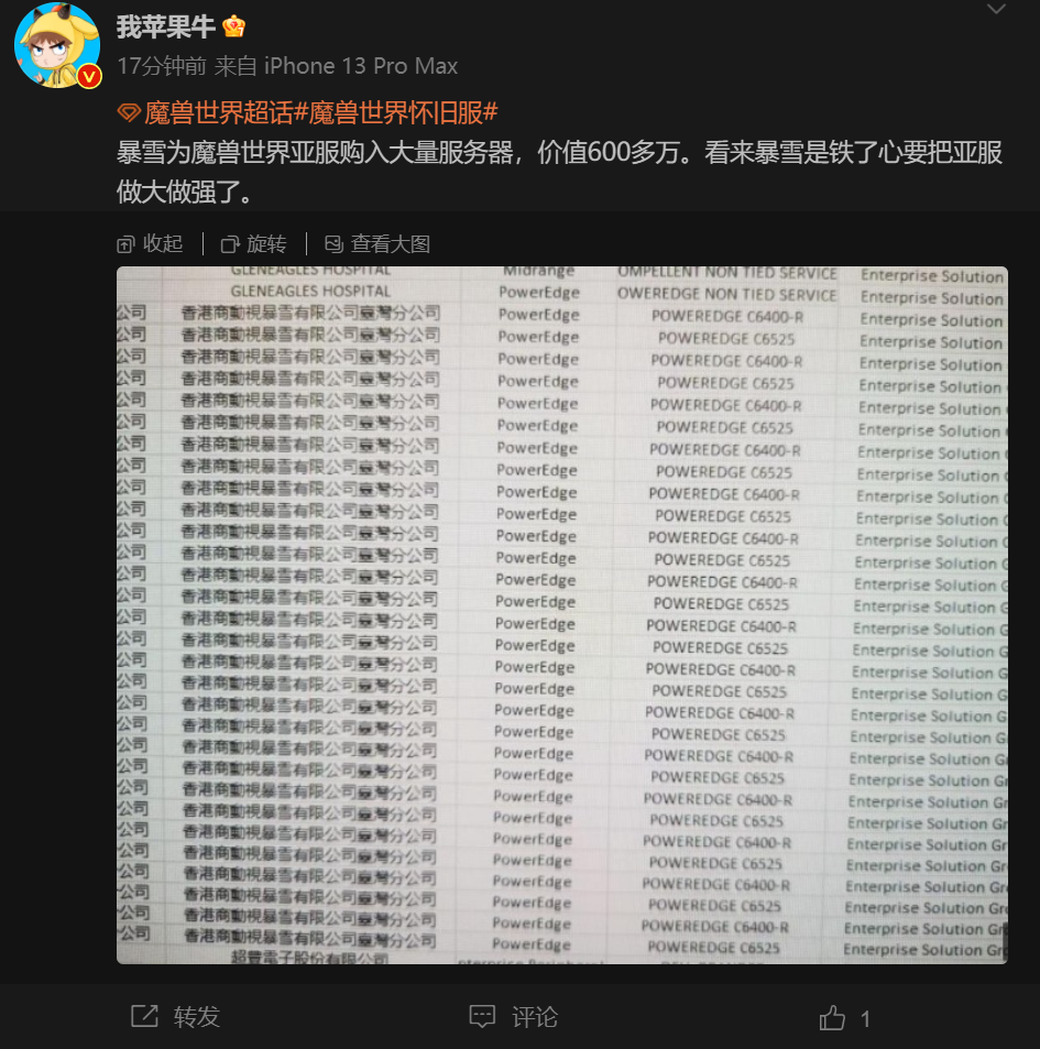 暴雪关停魔兽、暗黑等7款游戏的国服已经过去快3个月了,新的国服代理也没了音讯,国服重开遥遥无期,现在来看暴雪应该是要铁心自己搞了,巨资购买服务器自己代理。来自知名魔兽玩家@我苹果牛的爆料显示,暴雪为魔兽世界亚服购入了大量服务器,价值600多万。