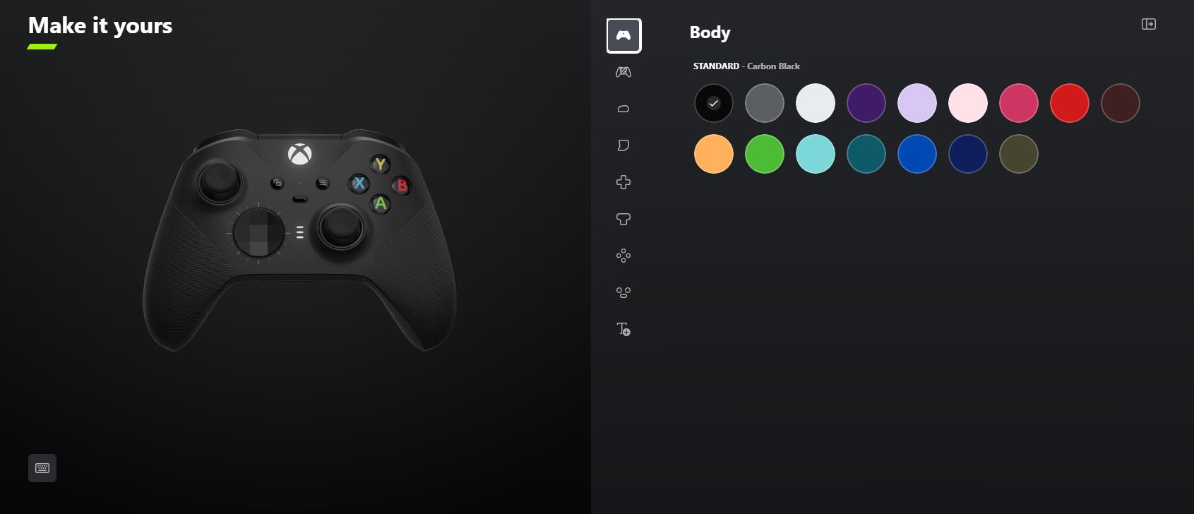 Xbox手柄定制服务“Xbox Design Lab”近日推出了精英手柄二代定制选项,玩家可以选择定制不同颜色的精英手柄二代,主体部分提供16种颜色定制,ABXY按键提供12种颜色,方向键和扳机键提供17中颜色,手柄其余部分提供25种颜色。