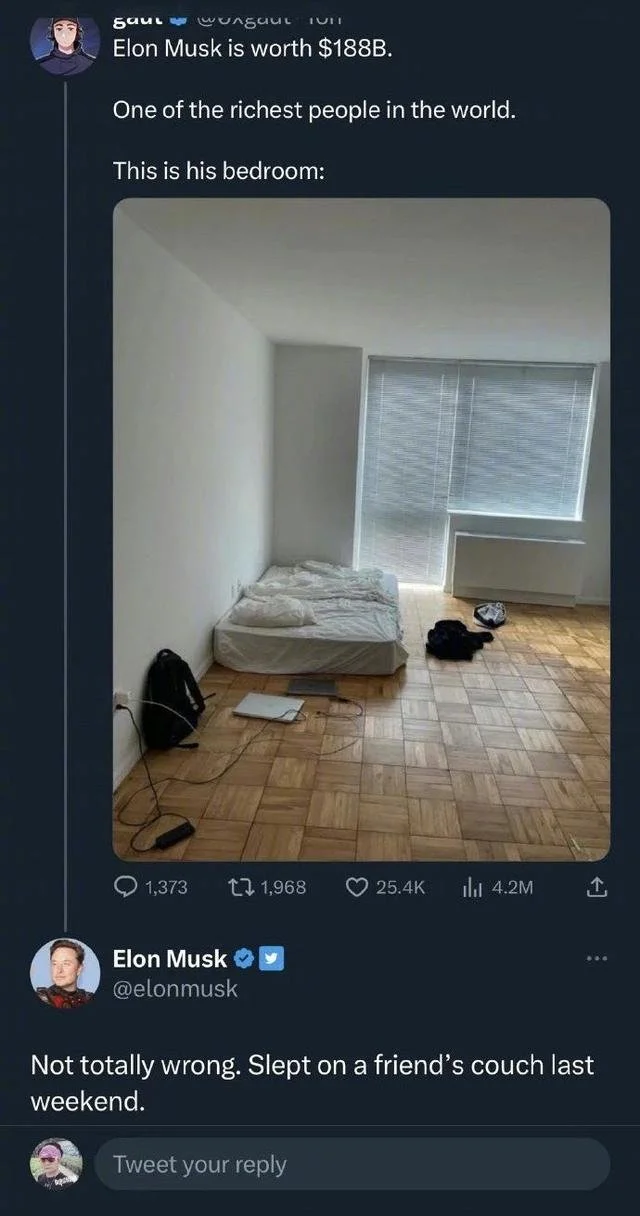 马斯克在该照片下回复称:“不完全错误,上周末睡在朋友家的沙发上。”