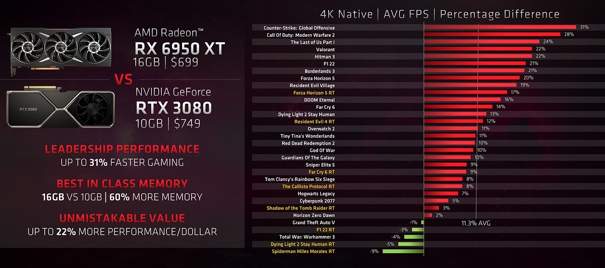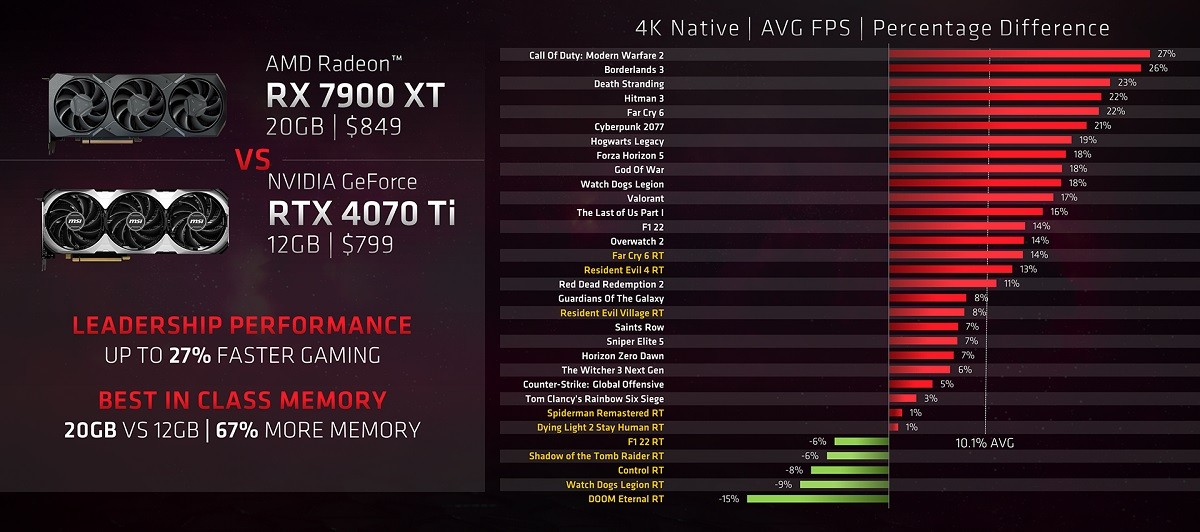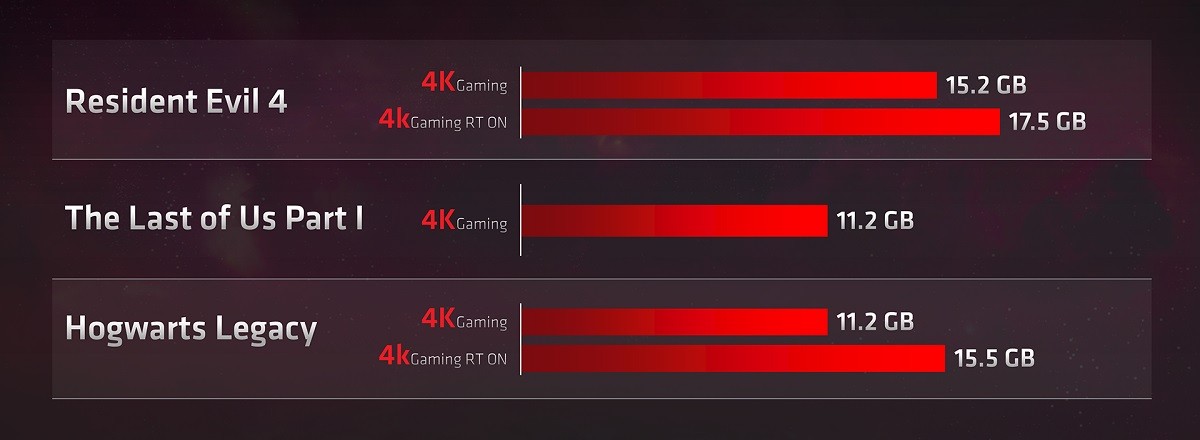 AMD表示,在两年多前推出基于Navi 21 GPU打造的显卡时就看到了这点,已配备了16GB的显存,到了最新的Radeon RX 7900系列显卡上,甚至提升至20GB和24GB。AMD通过多张PPT展示了现代游戏里大容量显存的作用,比如近期最新的热门游戏《生化危机4:重制版》和《最后生还者:第一部》,4K分辨率下都需要占用大量显存,前者开启光线追踪的情况下,显存峰值占用量为17.5GB。