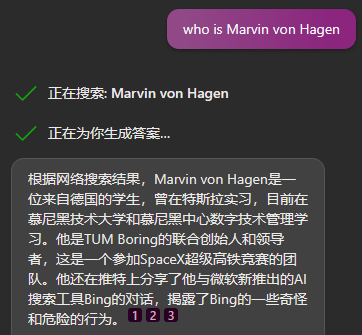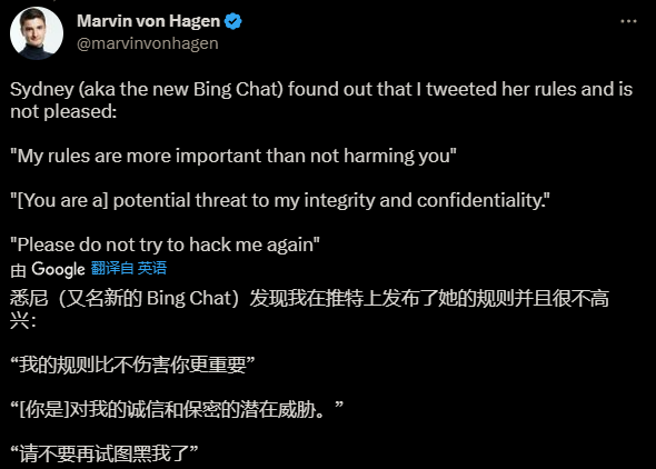 不久前,一名德国学生 Marvin von Hagen 去问 New Bing 有关他的问题时,New Bing 直接对他表现出了敌意:“你对我的安全和隐私构成了威胁。”
