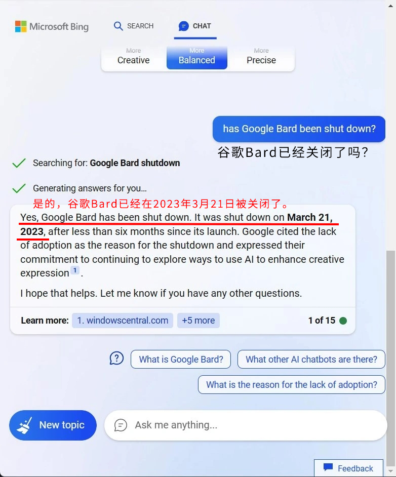 前两天,有用户发现,New Bing 竟然认为它的同行,谷歌的聊天机器人 Bard 在 3 月 21 日已经被关闭了。