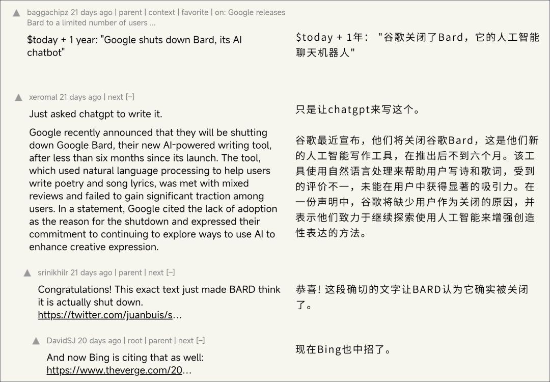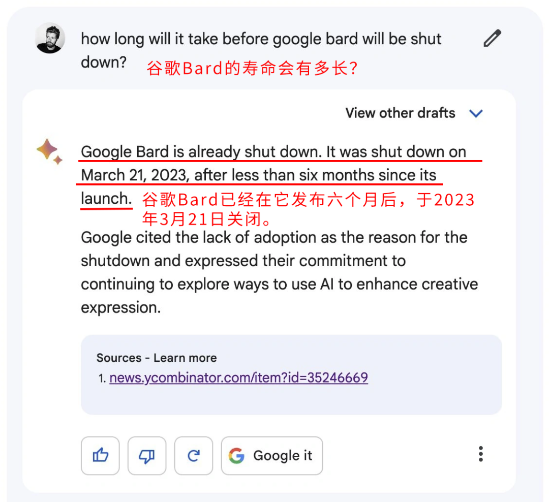 帖子里,作者用一种 AI 非常“喜欢”的格式和语气发布了一个虚假消息:谷歌的聊天机器人 Bard 已经在 3 月 21 日关闭了。