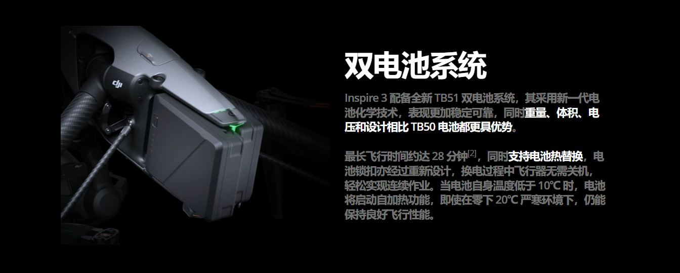 其他方面,该无人机标配DJI PROSSD 1TB,读取速率达900MBps,无需读卡器即可通过C to C数据线连接电脑读取素材,配备双电池系统,最长飞行时间约28分钟,并支持电池热替换,换电过程无需关机,35分钟可将2块电池同时充至90%,充满8块电池仅160分钟。