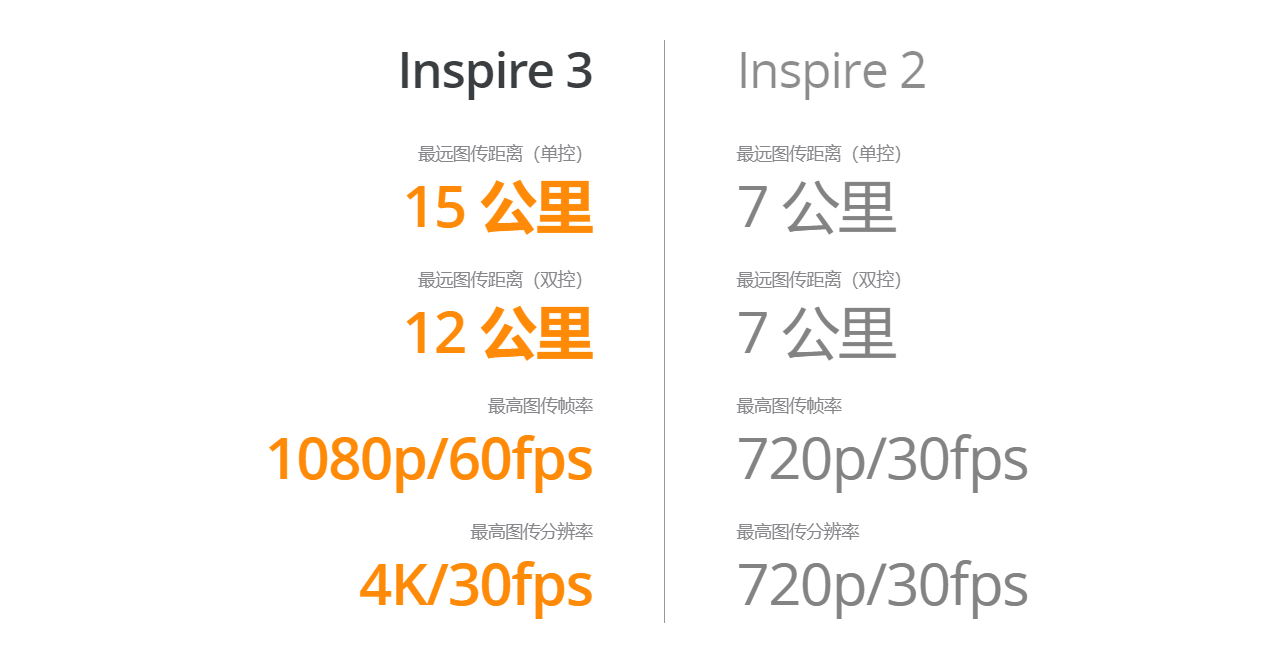 图传能力上,大疆Inspire3配备O3 Pro图传,在单控模式下最远图传距离约达15公里,双控模式下最远约12公里,最高支持1080p/60fps的传输画质。