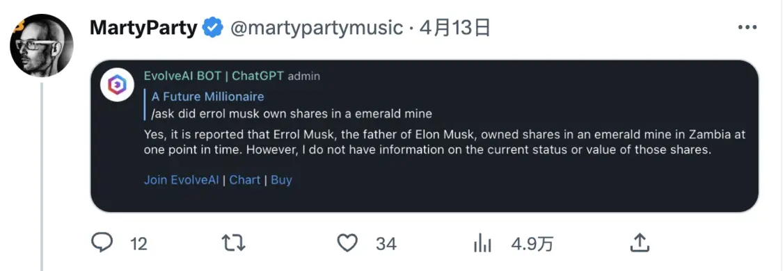 有网友还贴出了疑似向ChatGPT查询的截图。人工智能给出的答案是,报道称,马斯克的父亲埃罗尔曾经持有赞比亚一座翡翠矿的股份。