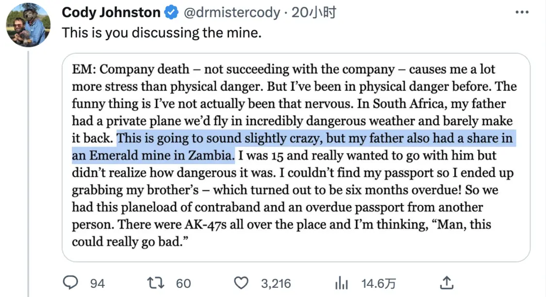 此话一出,Twitter网友都蠢蠢欲动了。有网友直接贴出了马斯克接受《福布斯》采访的截图,说“这就是你当初讨论翡翠矿的证据”。