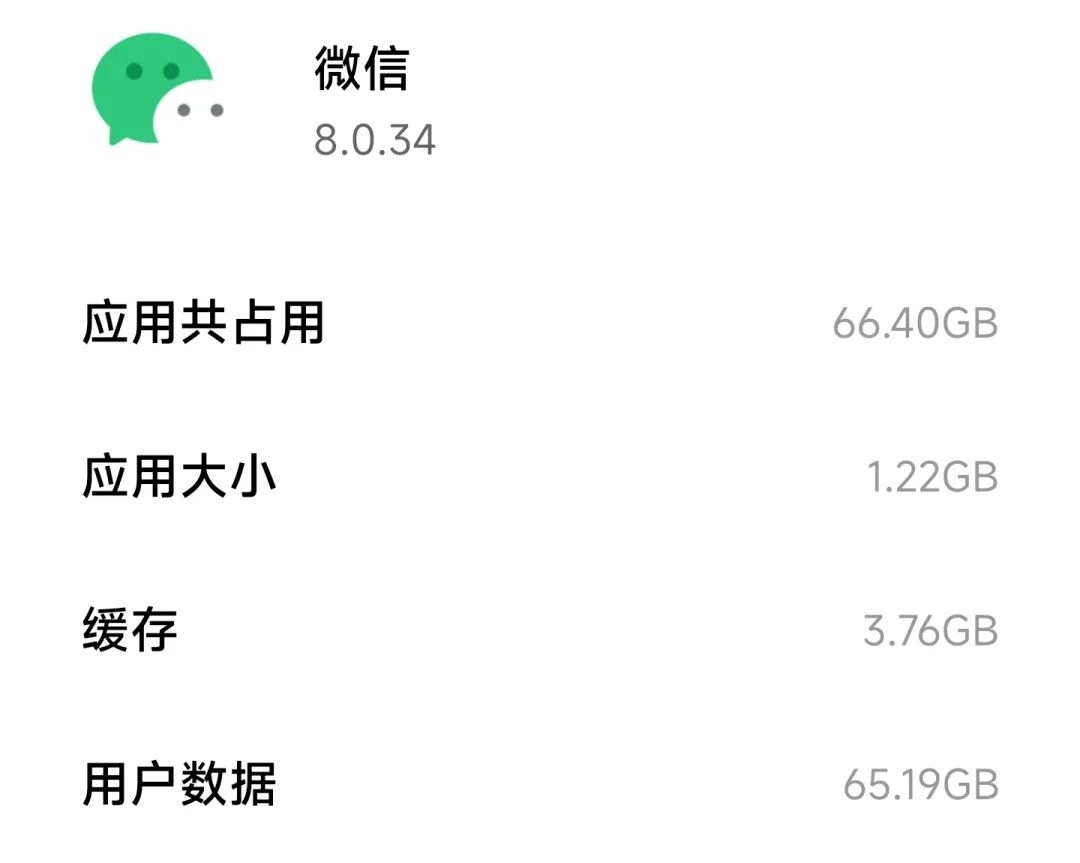 其中的吃空间大户就是微信,单就它一个 App 就吃掉了 66GB,应用本身大小 1.22GB,用户数据占 65GB,缓存则是占了 3.76GB,果然小而美。