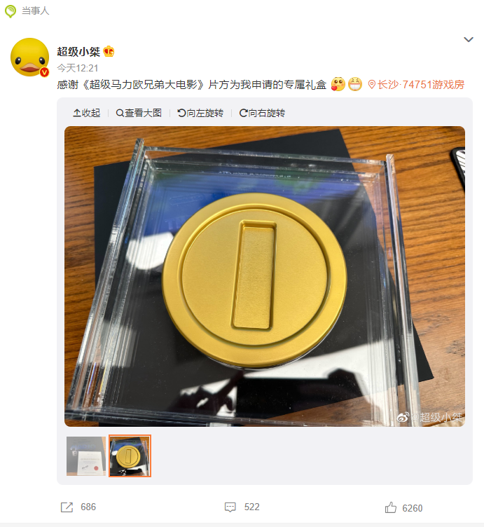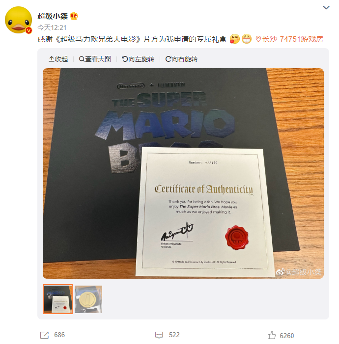 4月14日消息,前不久,斗鱼游戏主播超级小桀因《马力欧制造2》世界排名前30的纪录被亲戚家熊孩子清零一事登上热搜。今日,超级小桀发文表示,收到了由任天堂和环球影业共同送出的,全球限量、宫本茂亲笔签名的《超级马力欧兄弟大电影》金币礼盒。