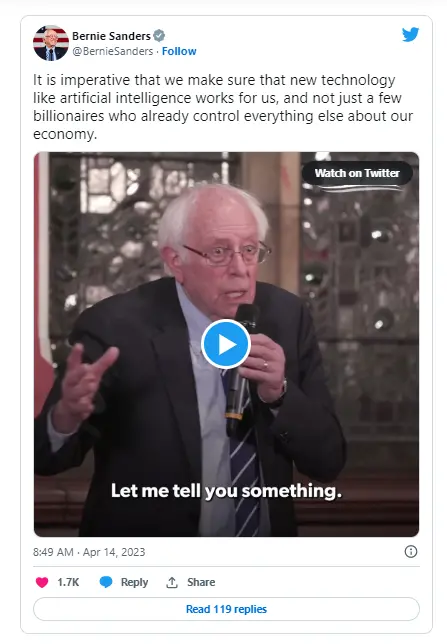 “我们必须确保人工智能等新技术为我们服务,而不仅仅是几个亿万富翁,他们已经控制了我们经济的其它一切。” 桑德斯写道。