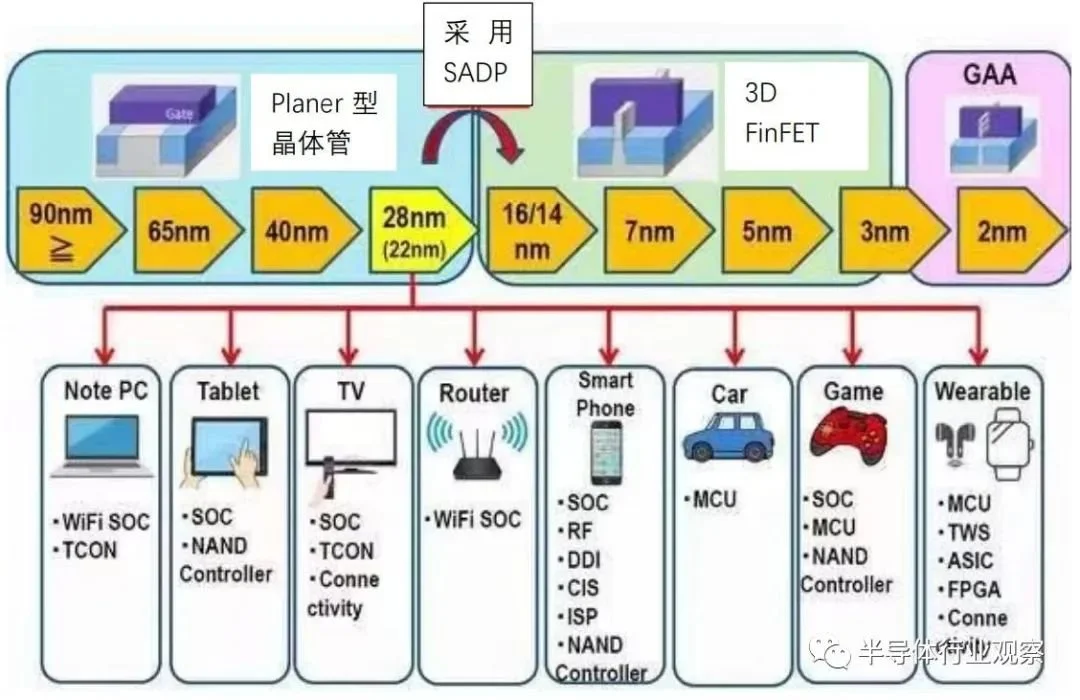 从28/22纳米到16/14纳米,虽然性能得以提高,成本也上升了,存在着这一不可调和的矛盾。就苹果的iPhone、High Performance Computing(高性能计算)方向而言,即使成本稍微上升,也会采用FinFET(采用了SADP),但是,汽车等其他大部分电子设备并不需要如此高的性能。28纳米技术节点的性能已经足够,甚至很多厂家更希望采用在成本上具有优势的28纳米。因此,就出现了下图的结果,大部分电子设备采用的半导体都集中在了28纳米上。