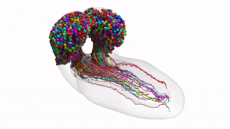 昆虫大脑中的全套神经元,这些神经元是用突触分辨率的电子显微镜重建的。资料来源:约翰霍普金斯大学/剑桥大学