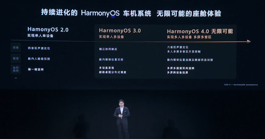 据了解,鸿蒙OS 4.0将在车机中实现多人多设备、多屏多音区,支持六音区声源定位,多人多屏多音区并发控制,相比鸿蒙2.0/3.0,鸿蒙OS 4.0还实现了舱内眼球位置追踪及眼部状态识别,并支持多屏多通道双向流转,多屏跨设备投屏。